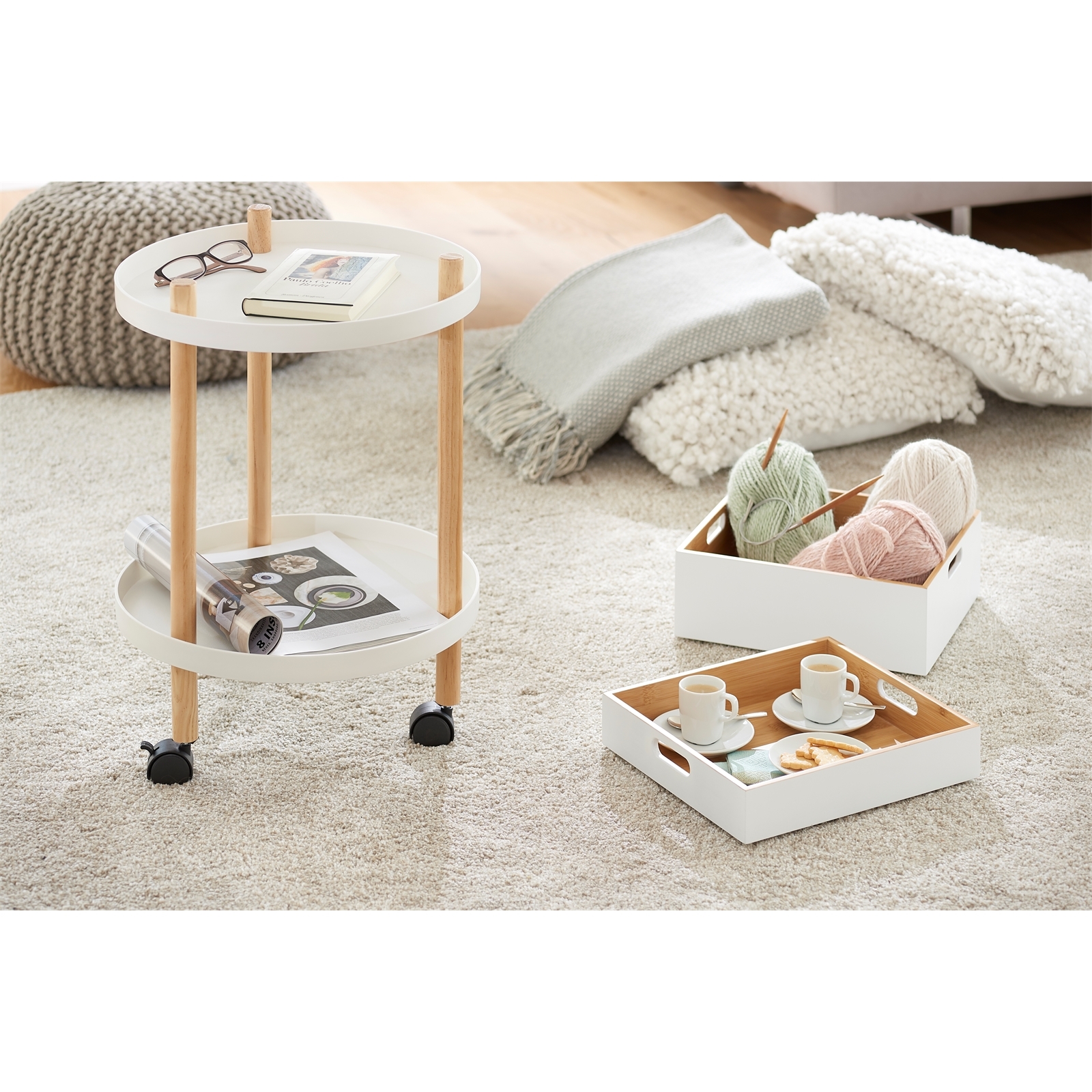 Diese weiße Allzweckkiste aus Holz ist ideal, um Ordnung ins Geschehen zu bringen. Das Design lehnt sich an skandinavisches Aussehen an. Hier kommen vor allem helle und warme Farben zum Einsatz, die mit geradlinigen Formen kombiniert werden. Mithilfe der Kiste bringen Sie schnell Ordnung in jedes Zimmer Ihres Zuhauses und setzen damit gleichzeitig dekorative Akzente. Der Ordnungshelfer lässt sich auf weiteren Varianten derselben Größe oder der kleineren niedrigeren Option stapeln und spart so Platz.