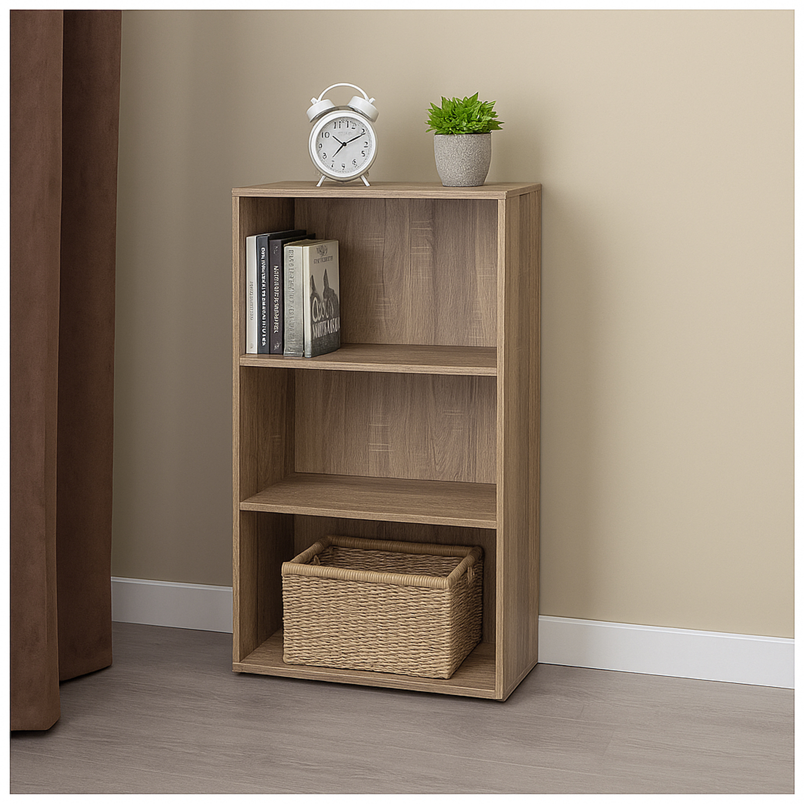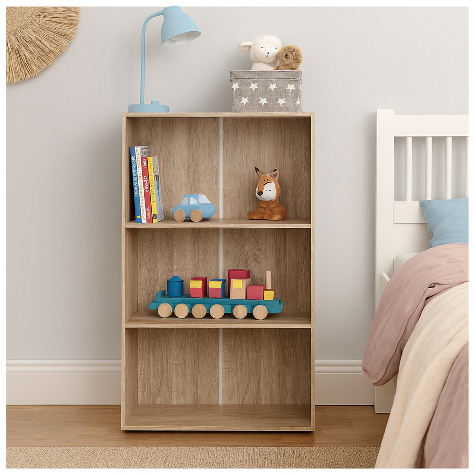 Dieses moderne Regal in Holzoptik überzeugt durch sein zeitloses Design, die kompakte Größe und seine Vielseitigkeit. Mit den Maßen B/H/T 60 x 115 x 30 cm passt es sowohl ins Wohnzimmer, Büro, Schlafzimmer oder Kinderzimmer. Dank 3 geräumiger Regalfächer bietet das Standregal genügend Platz für Bücher, Deko, Ordner oder Aufbewahrungsboxen.