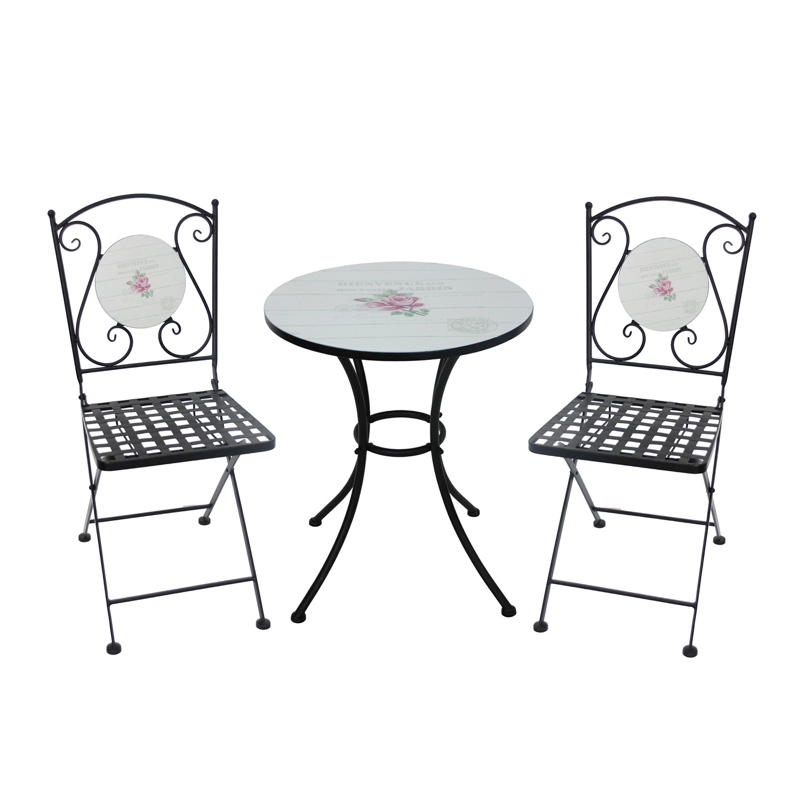 Vintage Style für Balkon, Terrasse und Garten (überdachter Außenbereich). Die Tischgruppe Celia aus Metall verzaubert mit einem tollen Vintageaufdruck sowie filigranen und verspielten Details. Das Set aus einem Tisch und 2 Stühlen schafft romantische Momente und ergänzt perfekt Ihre Wohndekoration.