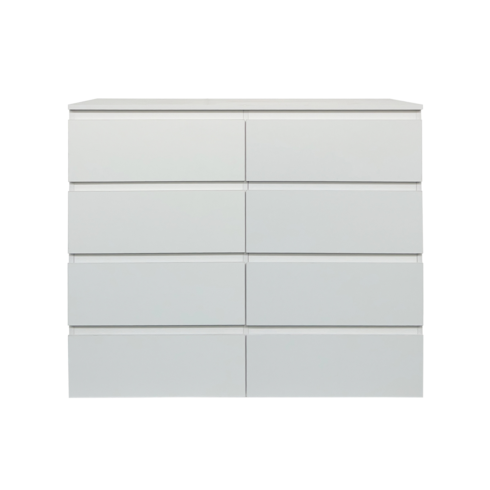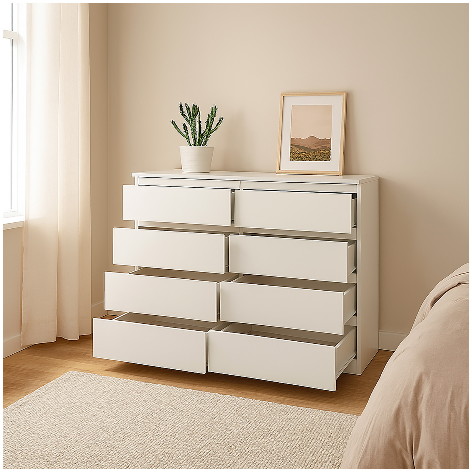 Diese elegante Kommode mit 8 Schubladen überzeugt durch ihr minimalistisches Design und großzügigen Stauraum. Die grifflosen Fronten unterstreichen den modernen Look und sorgen für eine nahtlose, glatte Oberfläche. Mit ihren kompakten Maßen eignet sich die Kommode ideal für Schlafzimmer, Wohnzimmer, Flur oder Büro.