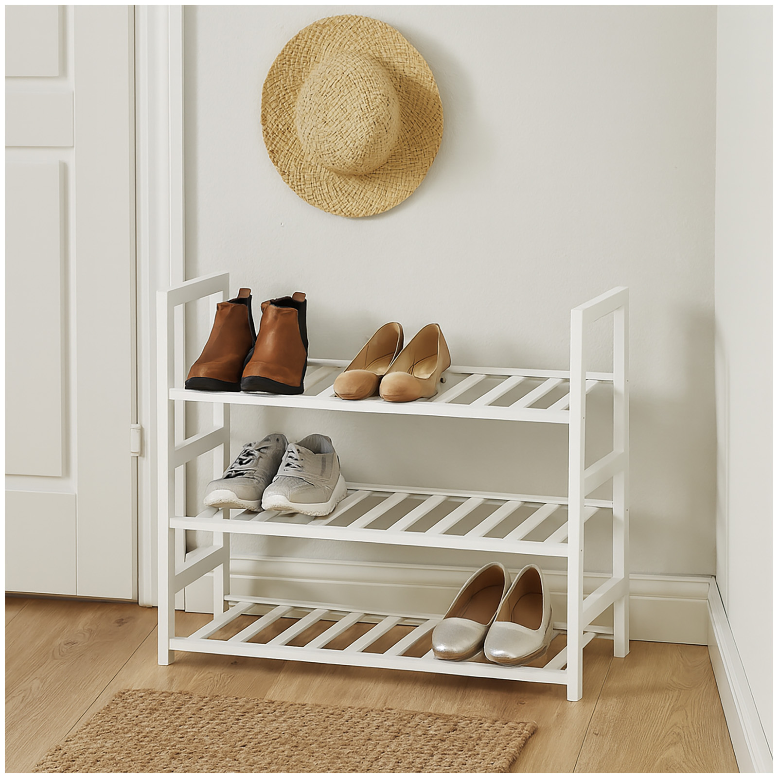 Dieses elegante Schuhregal aus Bambus in der Farbe Weiß vereint Funktionalität mit modernem Design. Mit den Maßen 71 x 60 x 26 cm (B/H/T) bietet es auf 3 Ebenen ausreichend Platz für Ihre Schuhe – von Sneakers über Sandalen bis hin zu eleganten Pumps.