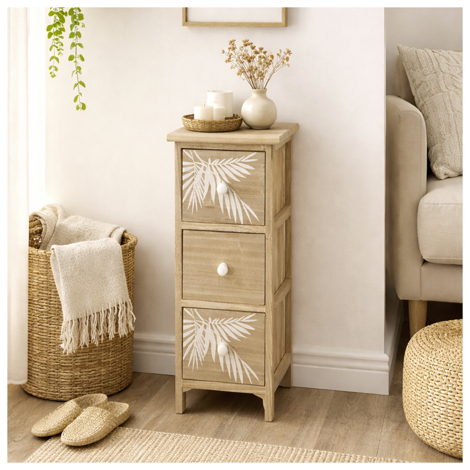 Diese dekorative Kommode aus Paulowniaholz verbindet natürliches Wohndesign mit funktionalem Stauraum. Das weiße Palmen-Dekor auf zwei der drei Schubladenfronten verleiht der Holzkommode eine moderne, helle und freundliche Ausstrahlung und macht sie zum echten Blickfang im Boho-, Skandi- oder Landhausstil. Die farblich abgestimmten runden Knopfgriffe fügen sich harmonisch in das Gesamtbild ein und unterstreichen die stilvolle Optik.