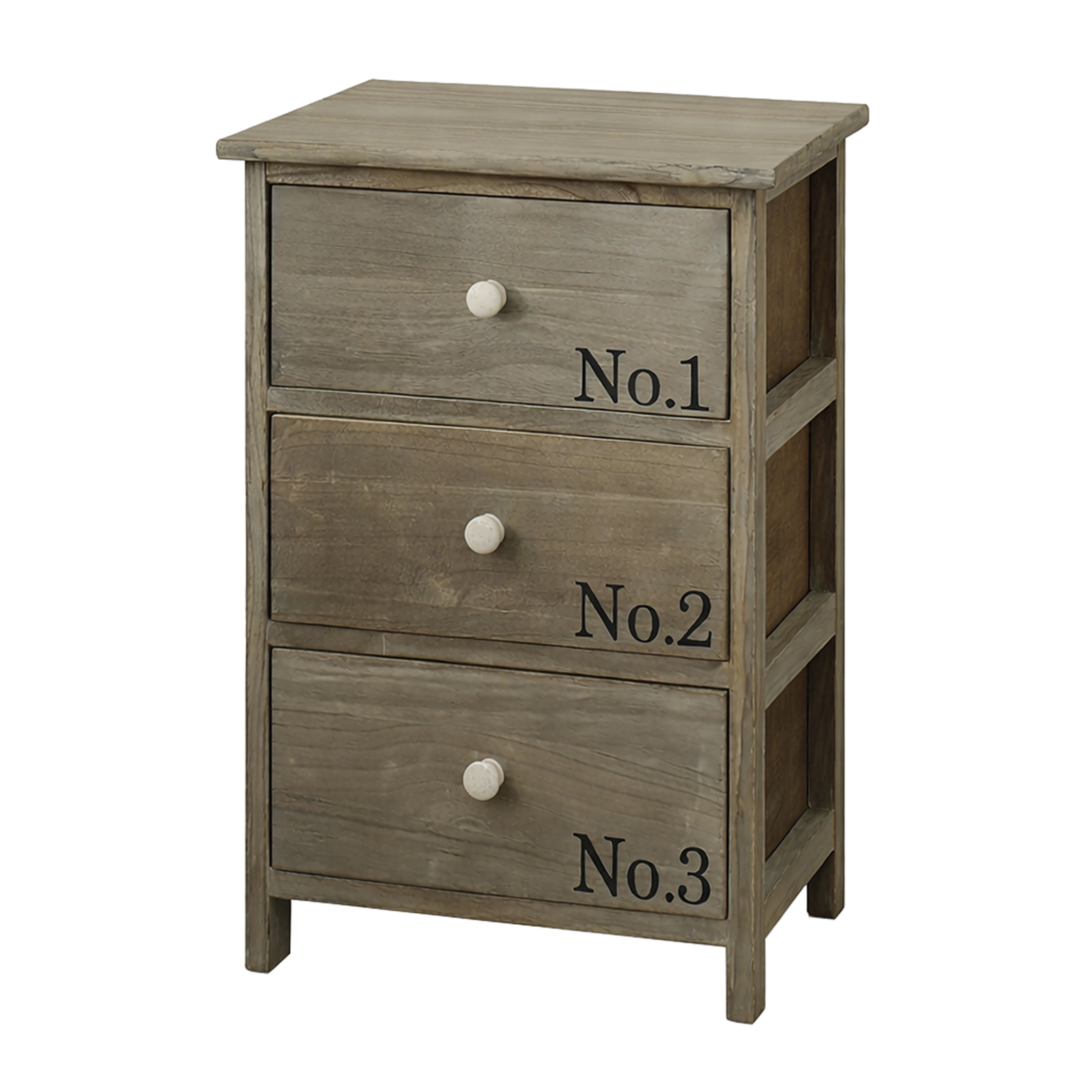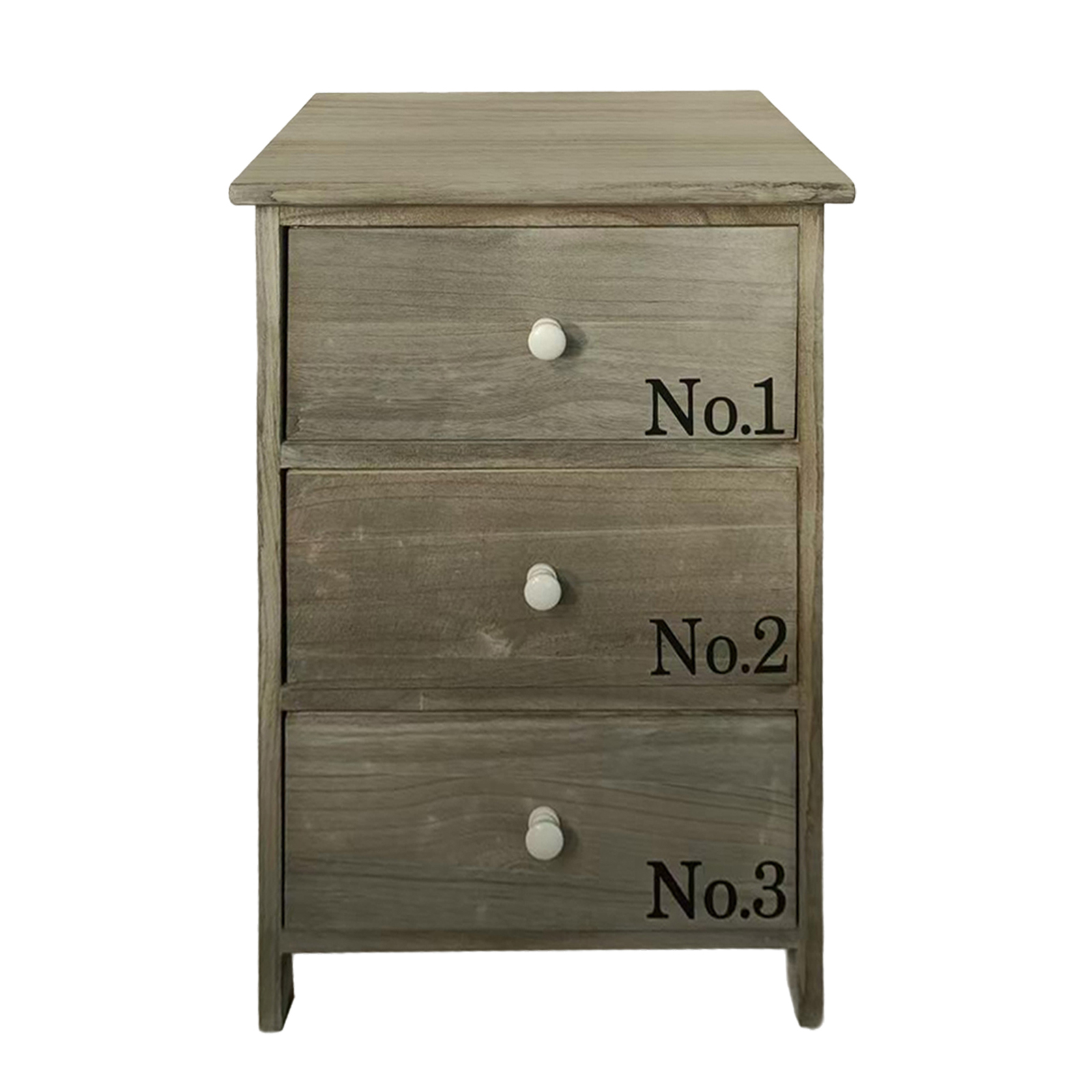 Diese Kommode aus Paulowniaholz im Landhaus-Stil mit einem Hauch Industrial-Charme ist dekorativer Blickfang und funktionaler Stauraum in einem. In Vintage-Holzoptik und Schubladenfronten mit dezenter „No.1 / No.2 / No.3“-Beschriftung sorgt sie für eine warme, gemütliche Wohnatmosphäre. Die runden Knopfgriffe fügen sich harmonisch in das Gesamtbild ein und unterstreichen die stilvolle Optik.