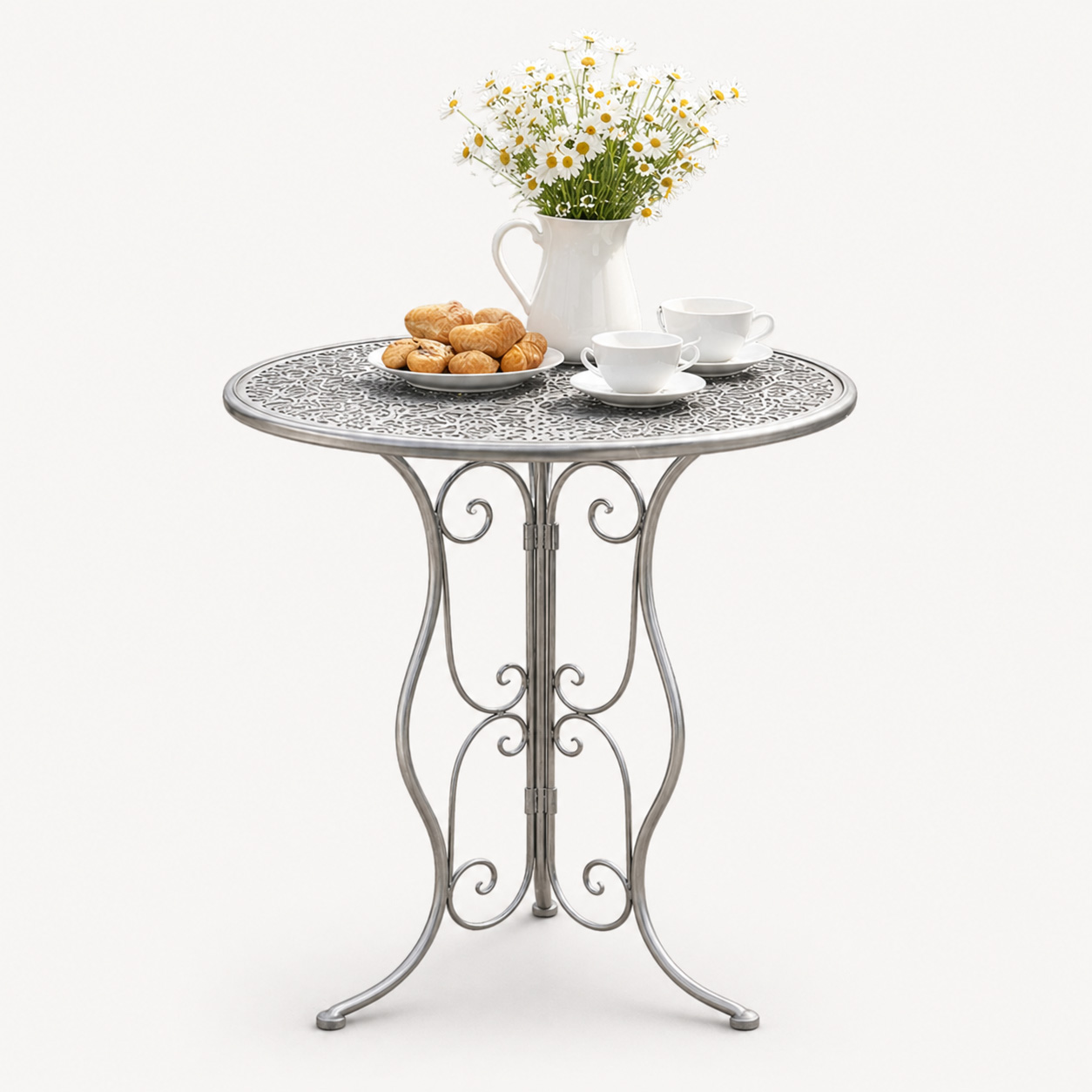 Nostalgie für Balkon, Terrasse und Garten (überdachter Außenbereich). Der Tisch Lani aus Metall verzaubert mit geschwungenen Formen, Schnörkeln sowie filigranen und verspielten Details.