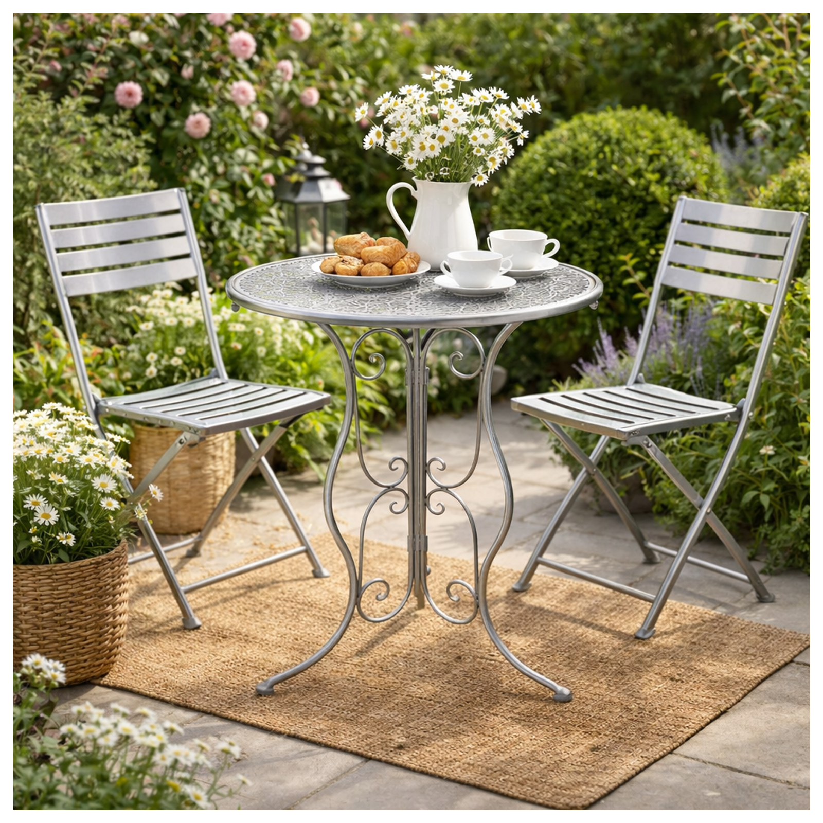 Kombiniert mit den passenden Stühlen ergänzt die romantische Sitzgruppe perfekt Ihre Wohn- und Gartendekoration. Die Stühle sind nicht im Lieferumfang enthalten, können jedoch separat bestellt werden.