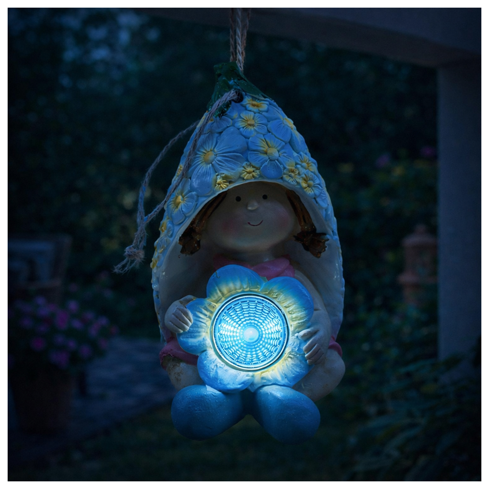 Gefertigt aus robustem Polyresin, ist die Figur wetterfest und für den Außenbereich bestens geeignet. Dank der integrierten Solartechnik lädt sich die Leuchte tagsüber automatisch auf und schaltet sich bei Dämmerung selbstständig ein – ganz ohne Kabel oder Stromkosten. Die praktische Aufhängung ermöglicht eine flexible Platzierung an Ästen, Haken oder Pergolen.