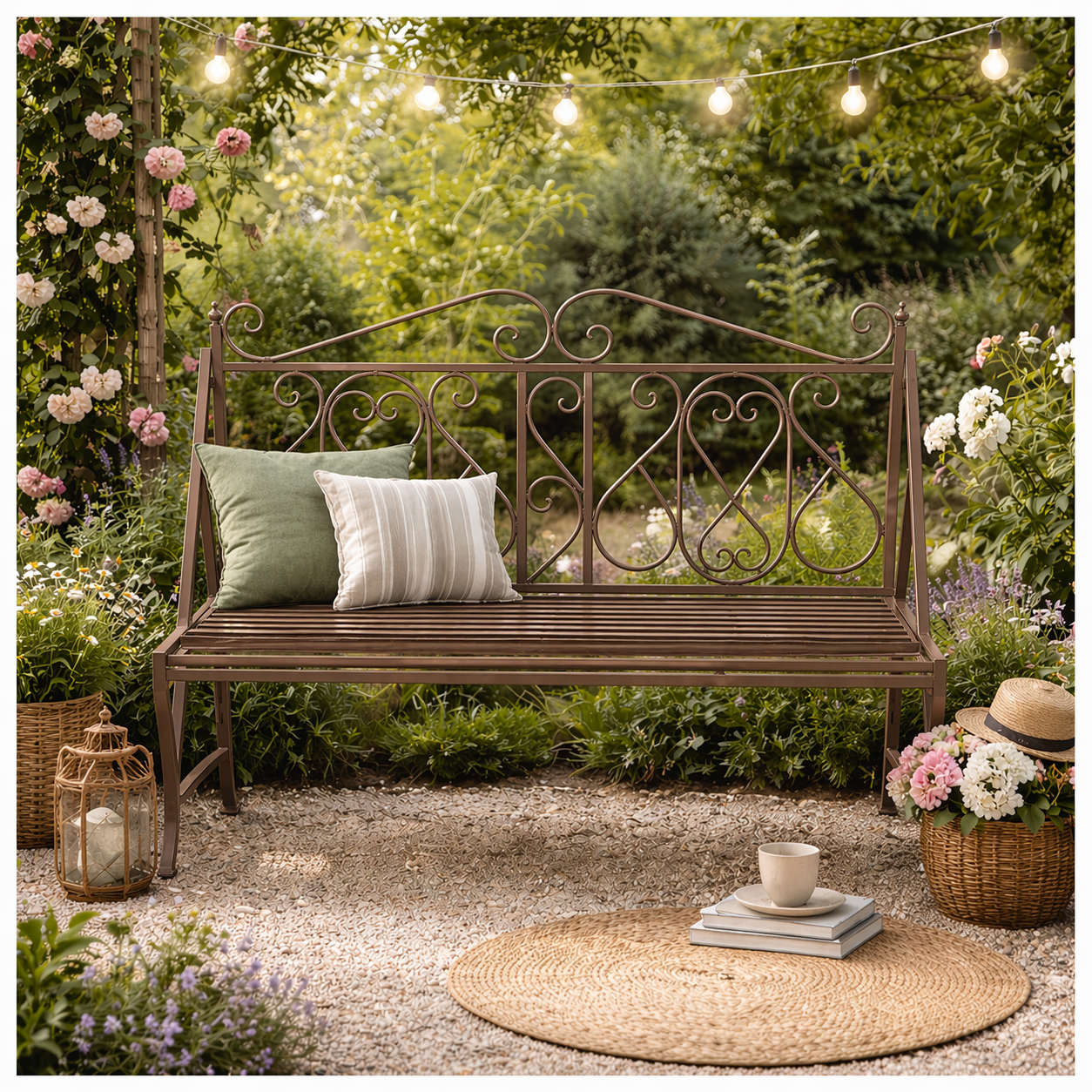 Zaubern Sie mit der Gartenbank Solea einen stilvollen Akzent auf dem Balkon, der Terrasse und im Garten. Die Bank mit robustem Metallgestell sorgt mit geschwungenen Ornamenten und Landhauscharme für eine einladenden Atmosphäre. Perfekt für entspannte Stunden im Wintergarten oder überdachten Außenbereich.