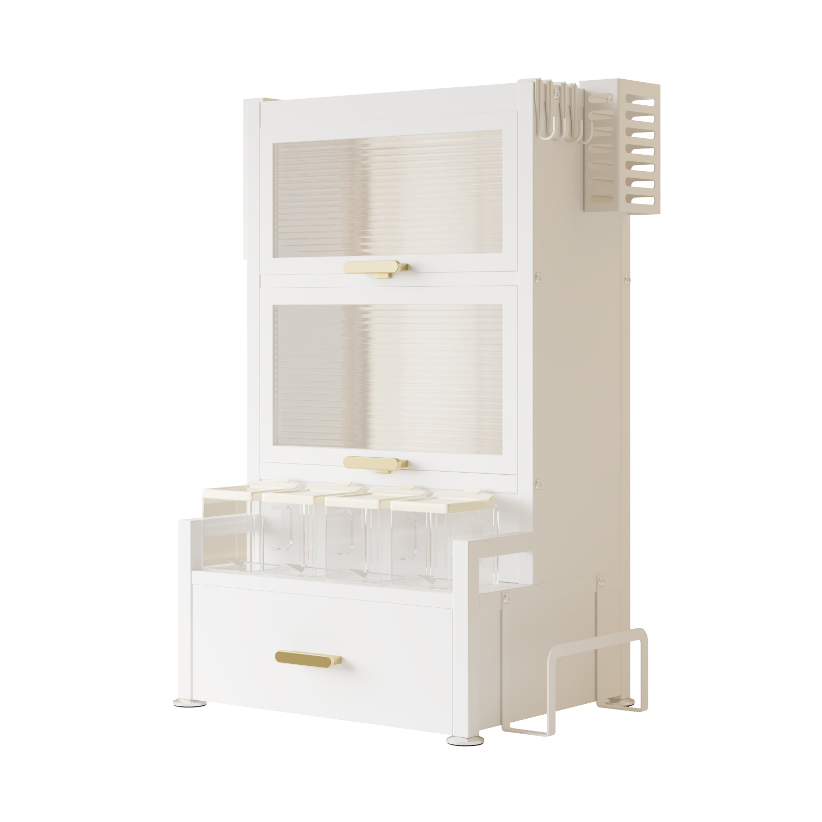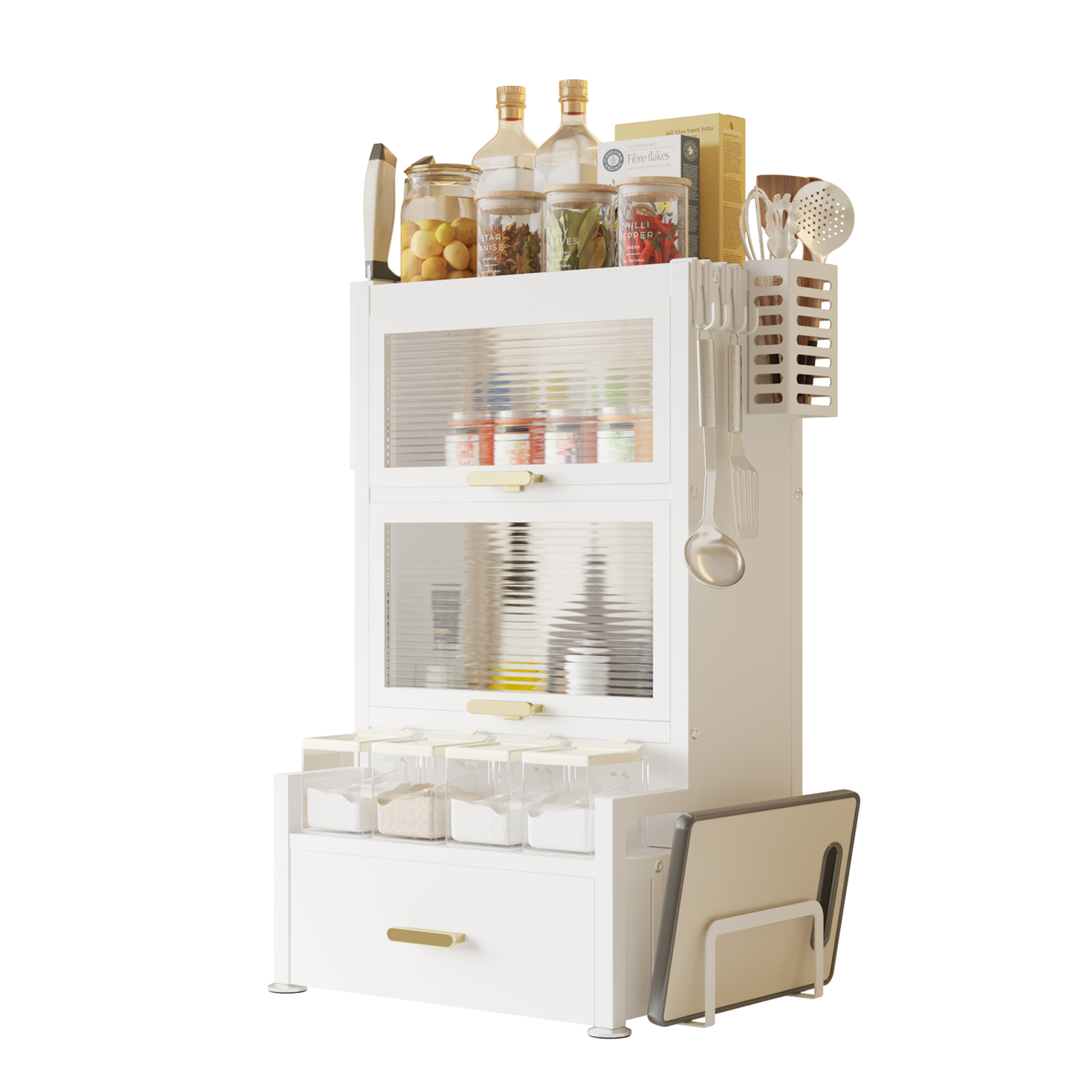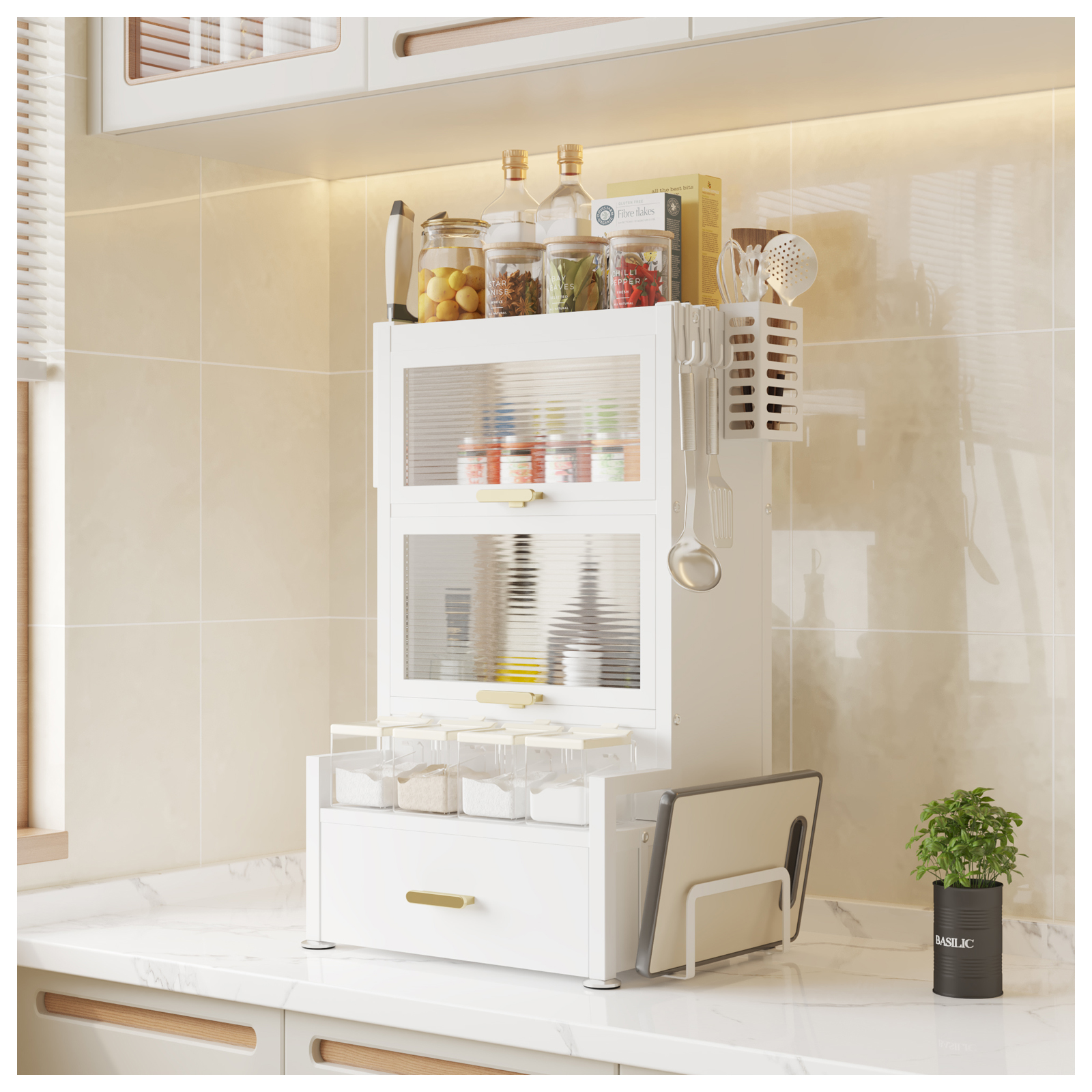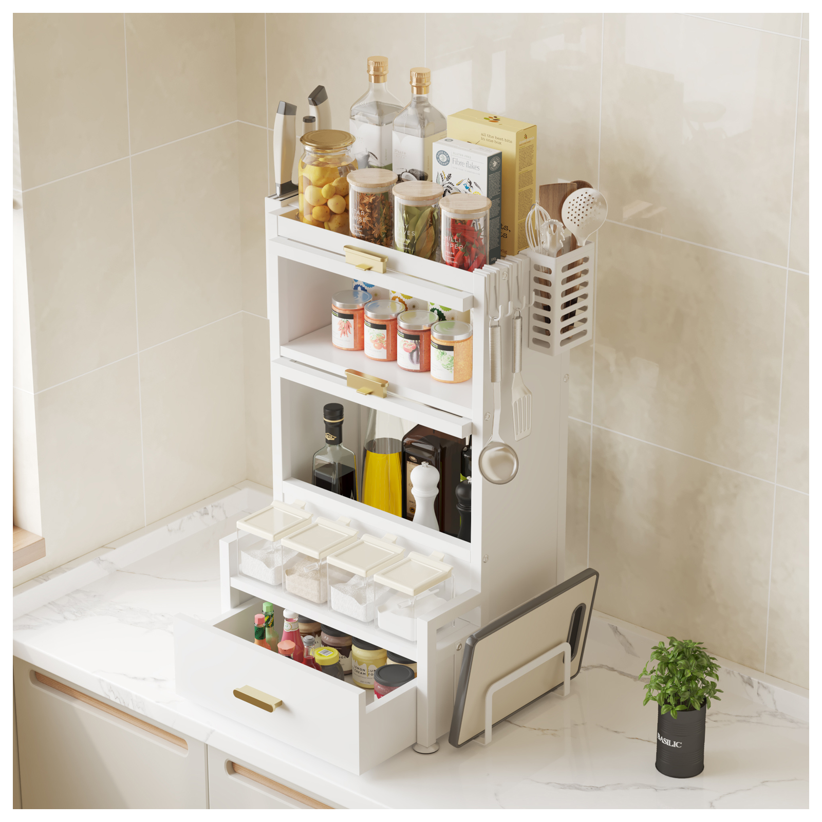 Das praktische Gewürzregal sorgt für perfekte Organisation Ihrer Gewürze, Öle und Küchenutensilien. Mehrere Ebenen, 2 Regalfächer mit Türen, eine Schublade sowie integrierte Halter schaffen zusätzlichen Stauraum auf kleiner Fläche.