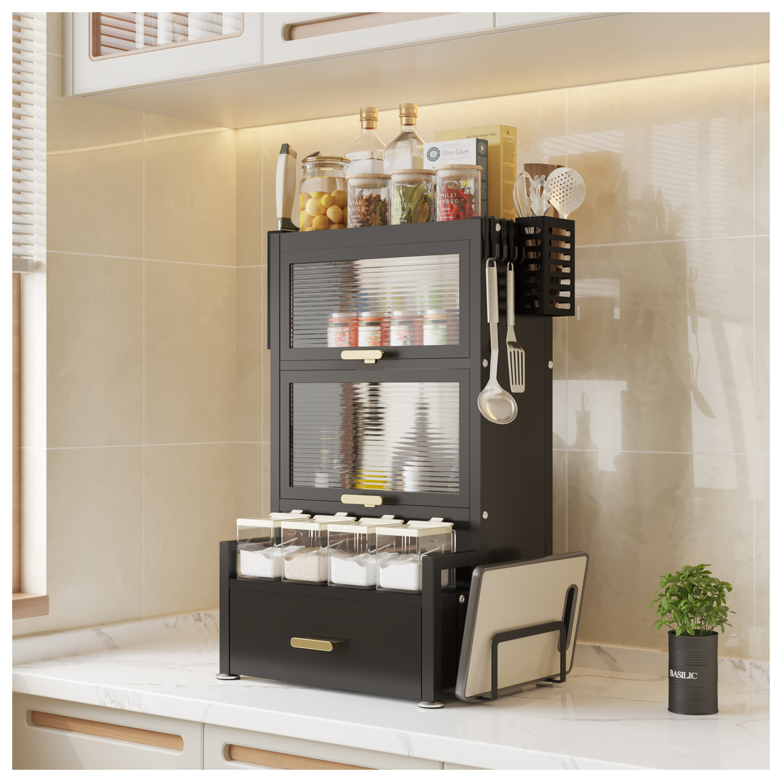 Gefertigt aus robustem Eisen, überzeugt der Küchenorganizer durch hohe Stabilität und Langlebigkeit. Die modernen Türen mit Kunststofffront schützen Ihre Gewürze vor Staub und verleihen dem Gewürzschrank gleichzeitig ein elegantes Design. Sie lassen sich dank cleverem Schiebemechanismus platzsparend nach oben öffnen.