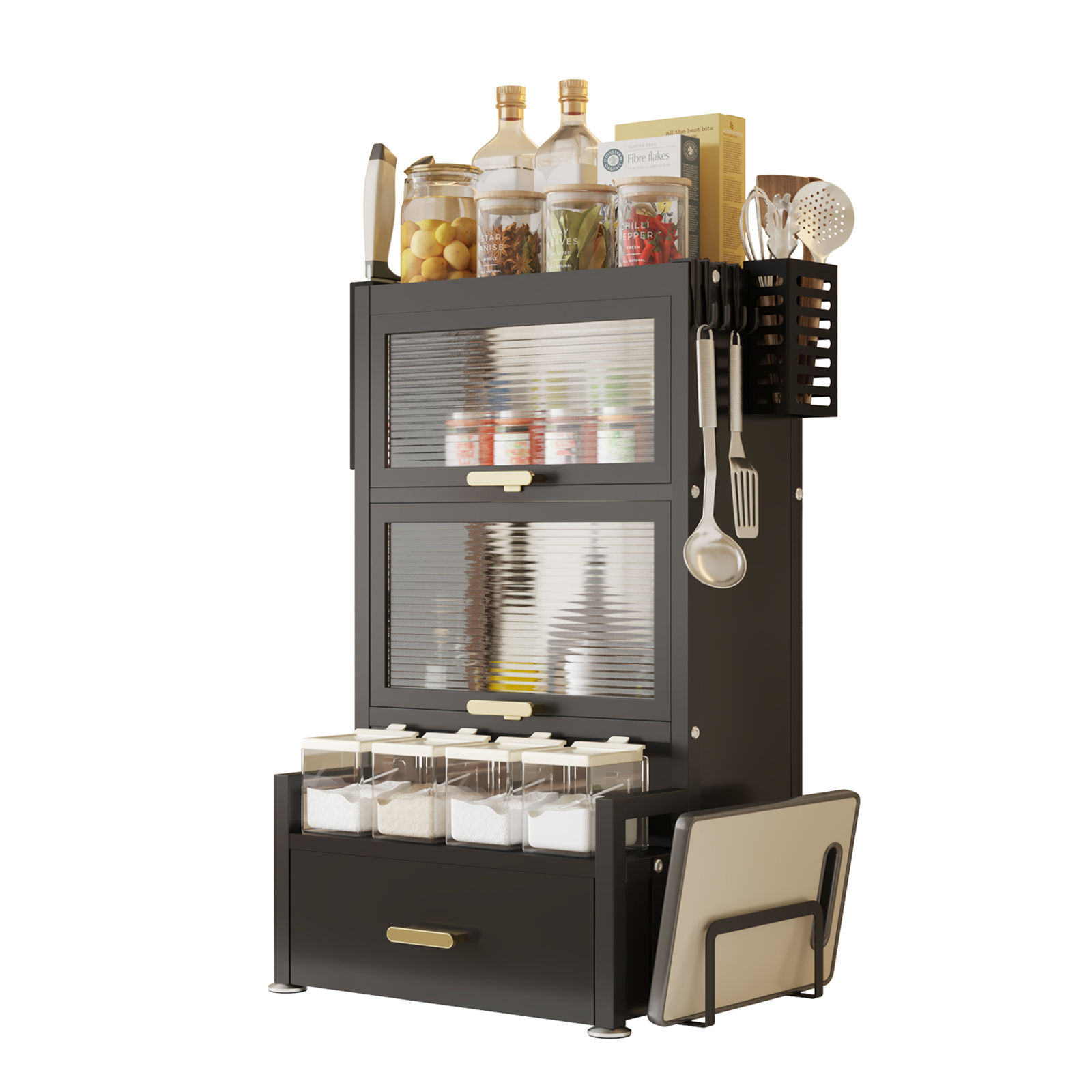 Das praktische Gewürzregal sorgt für perfekte Organisation Ihrer Gewürze, Öle und Küchenutensilien. Mehrere Ebenen, 2 Regalfächer mit Türen, eine Schublade sowie integrierte Halter schaffen zusätzlichen Stauraum auf kleiner Fläche.