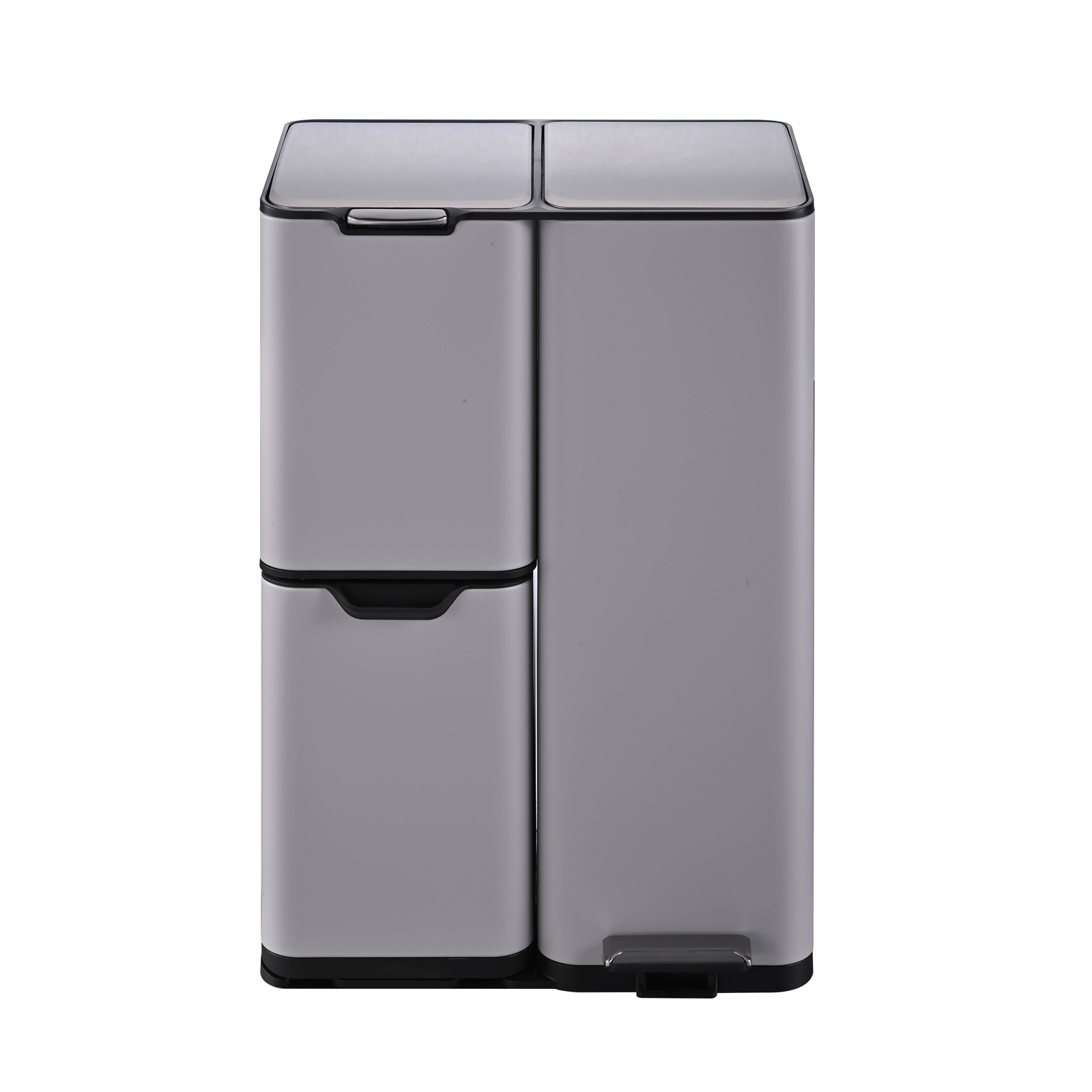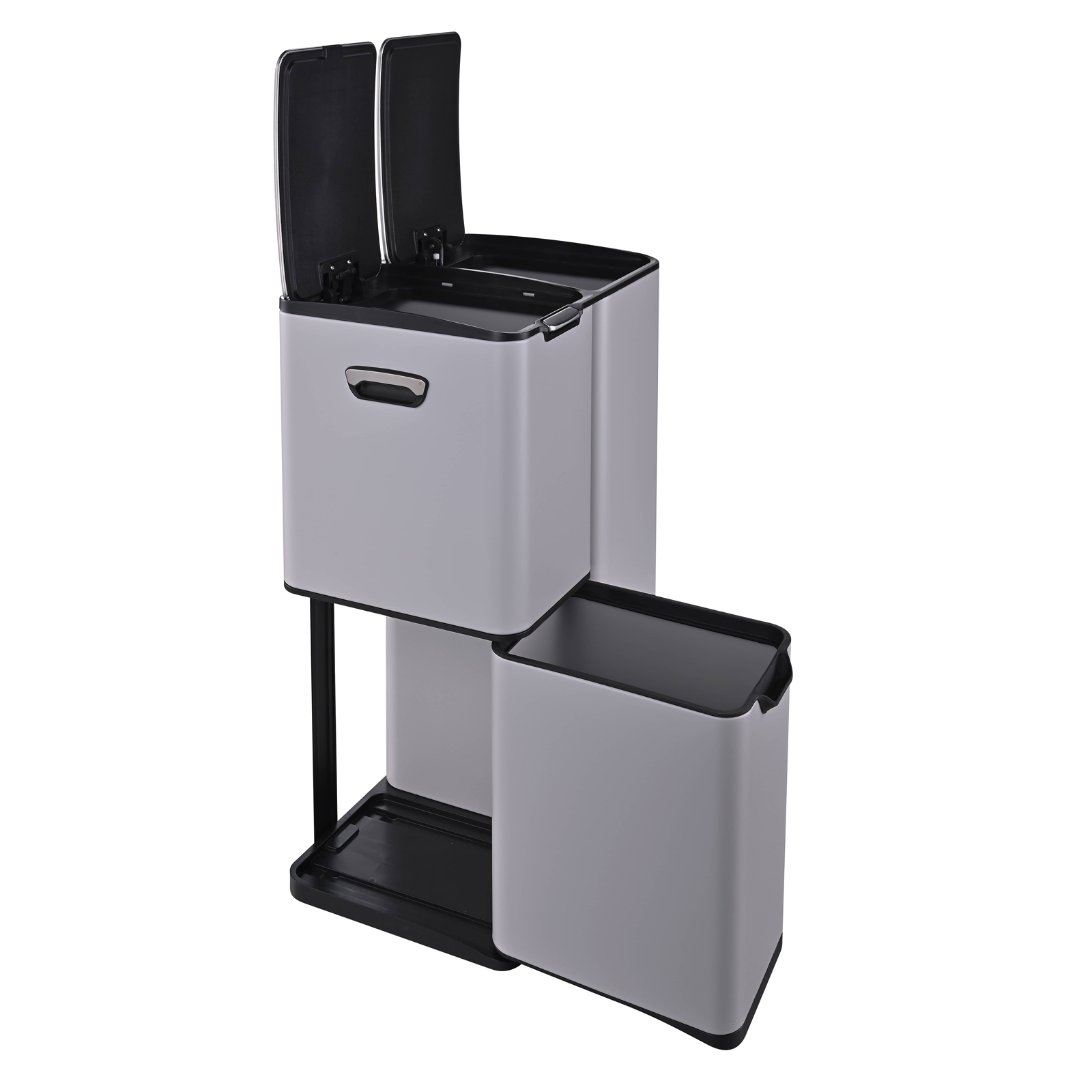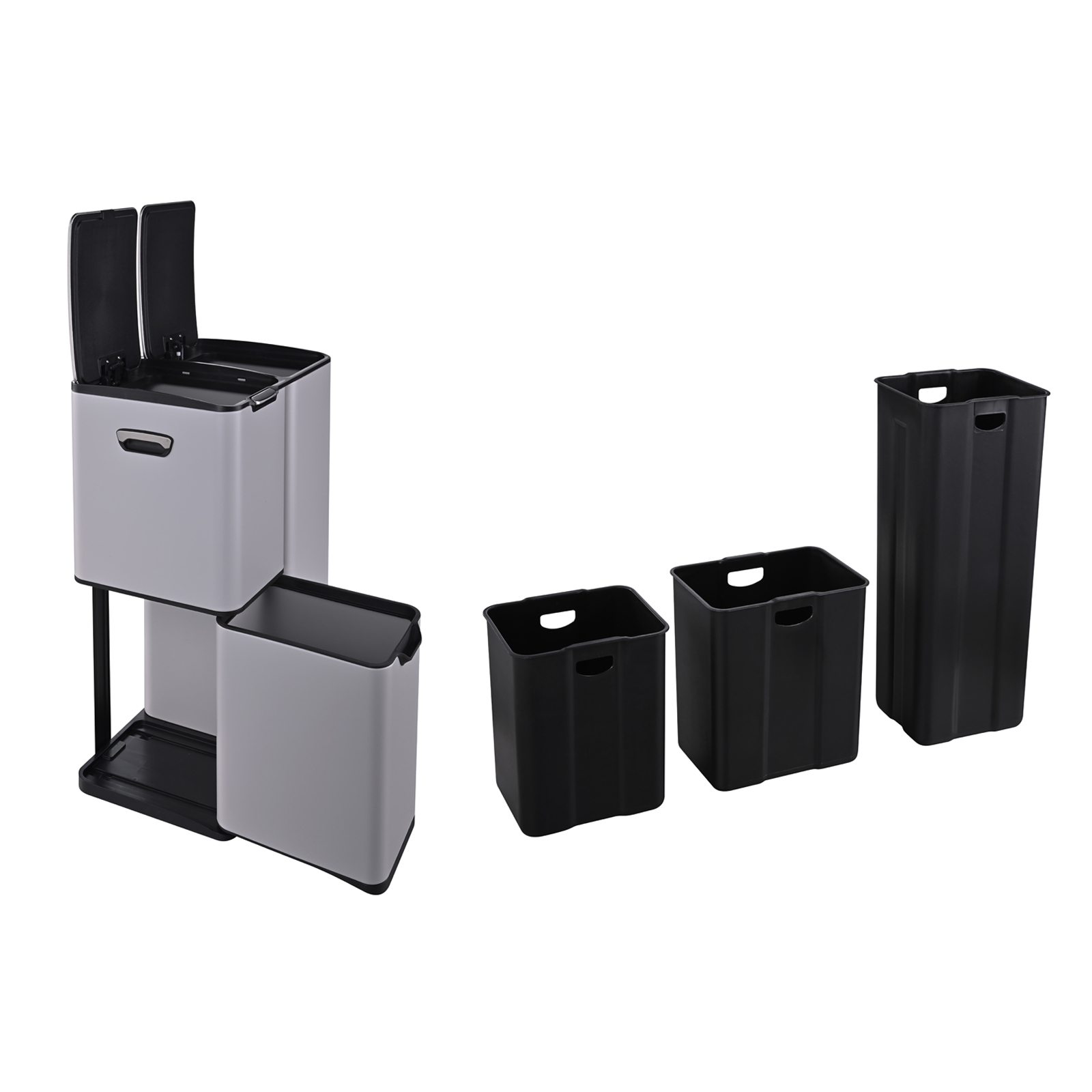 Dank des praktischen Trittmechanismus lässt sich der große 30-Liter-Eimer mühelos per Fuß öffnen. Der obere kleine Eimer (13 Liter) verfügt über einen Knopfdruck-Deckel, während der untere 17-Liter-Eimer als Schublade herausziehbar ist. Alle drei Inneneimer aus Kunststoff sind herausnehmbar, sodass sie besonders einfach zu Entleeren und Reinigen sind.
