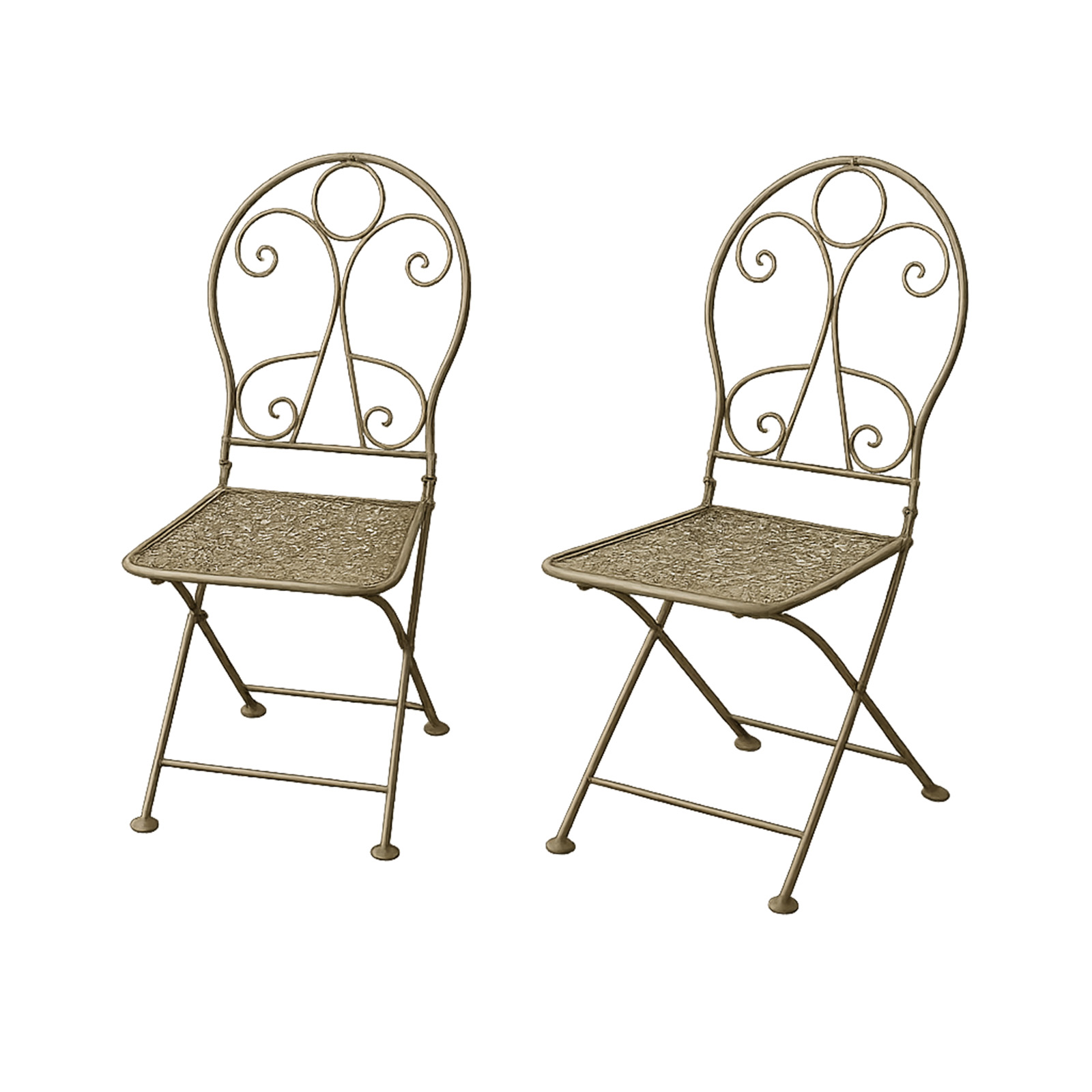 Diese stilvolle Tischgruppe im Vintage-Stil, bestehend aus einem Tisch und zwei passenden Stühlen, erinnert an laue Sommernachmittage bei Kaffee und Kuchen. Das filigrane Metallgestell und die dekorativen Lochmuster in Tischplatte und Sitzflächen verleihen dem Set einen nostalgischen Charme. Feine Schnörkel in den Rückenlehnen unterstreichen den klassischen Landhausstil und machen die Gruppe zu einem echten Blickfang.