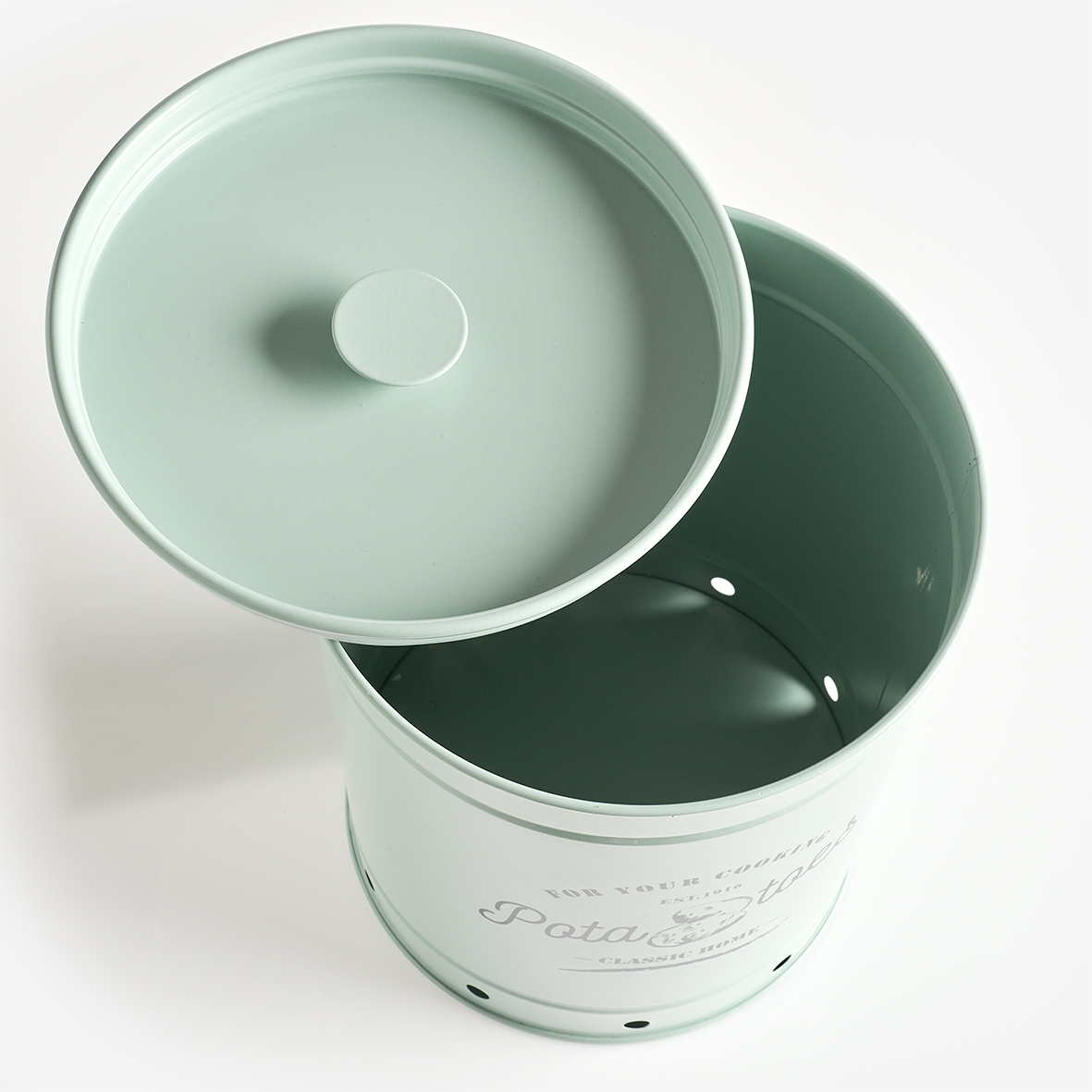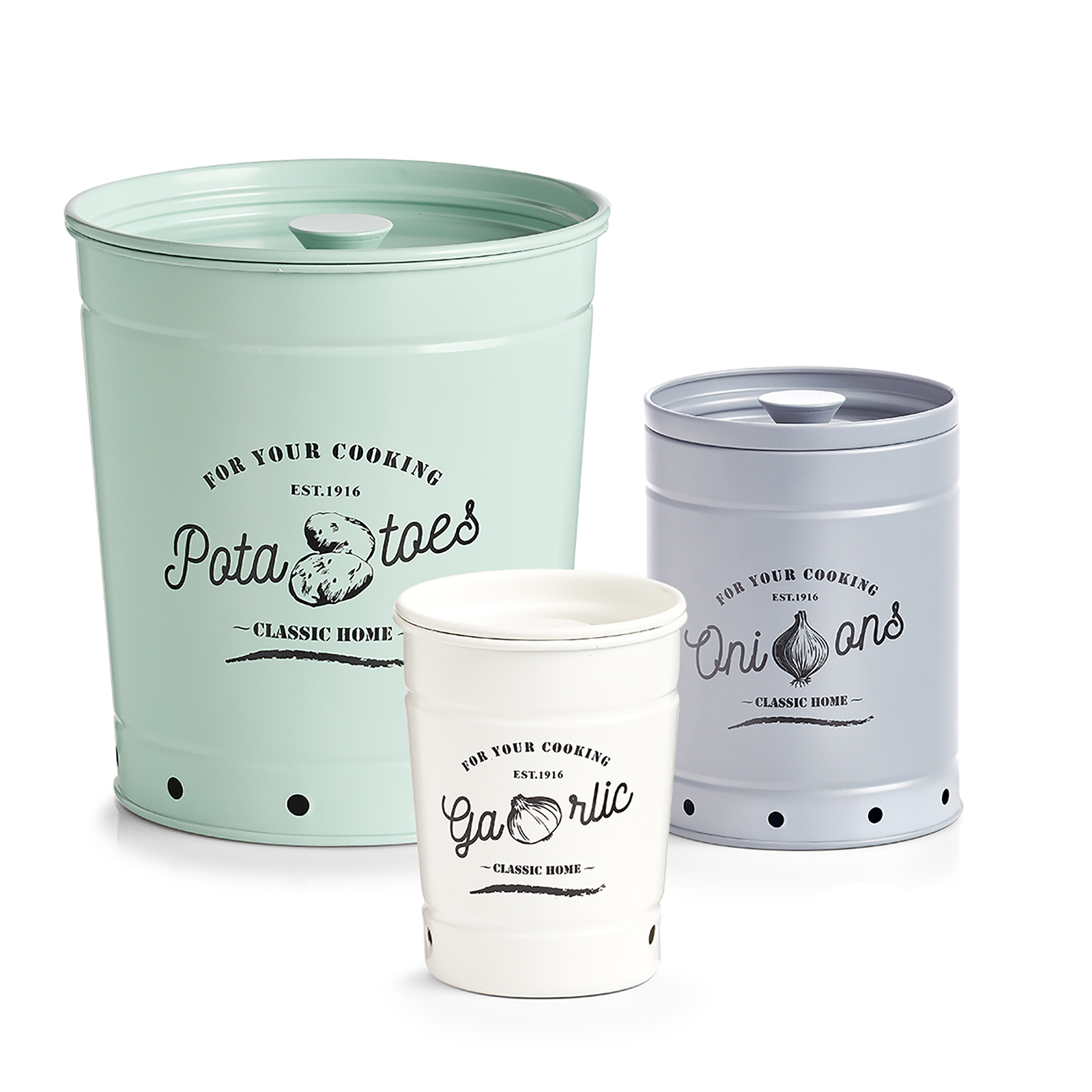 Damit Kartoffel, Zwiebel und Knoblauch frisch bleiben, müssen die Knollen richtig gelagert werden. Sie bevorzugen eine dunkle Lagerung im Trockenen, allerdings muss jederzeit eine Zirkulation gewährleistet sein. Auf diese Bedürfnisse gehen die passenden Vorratsdosen mit abnehmbarem Deckel optimal ein. So lassen sich die Knollen nicht nur richtig, sondern auch dekorativ in jeder Küche aufbewahren. Der Artikel ist lebensmittelecht und aus hochwertigem Metall hergestellt.