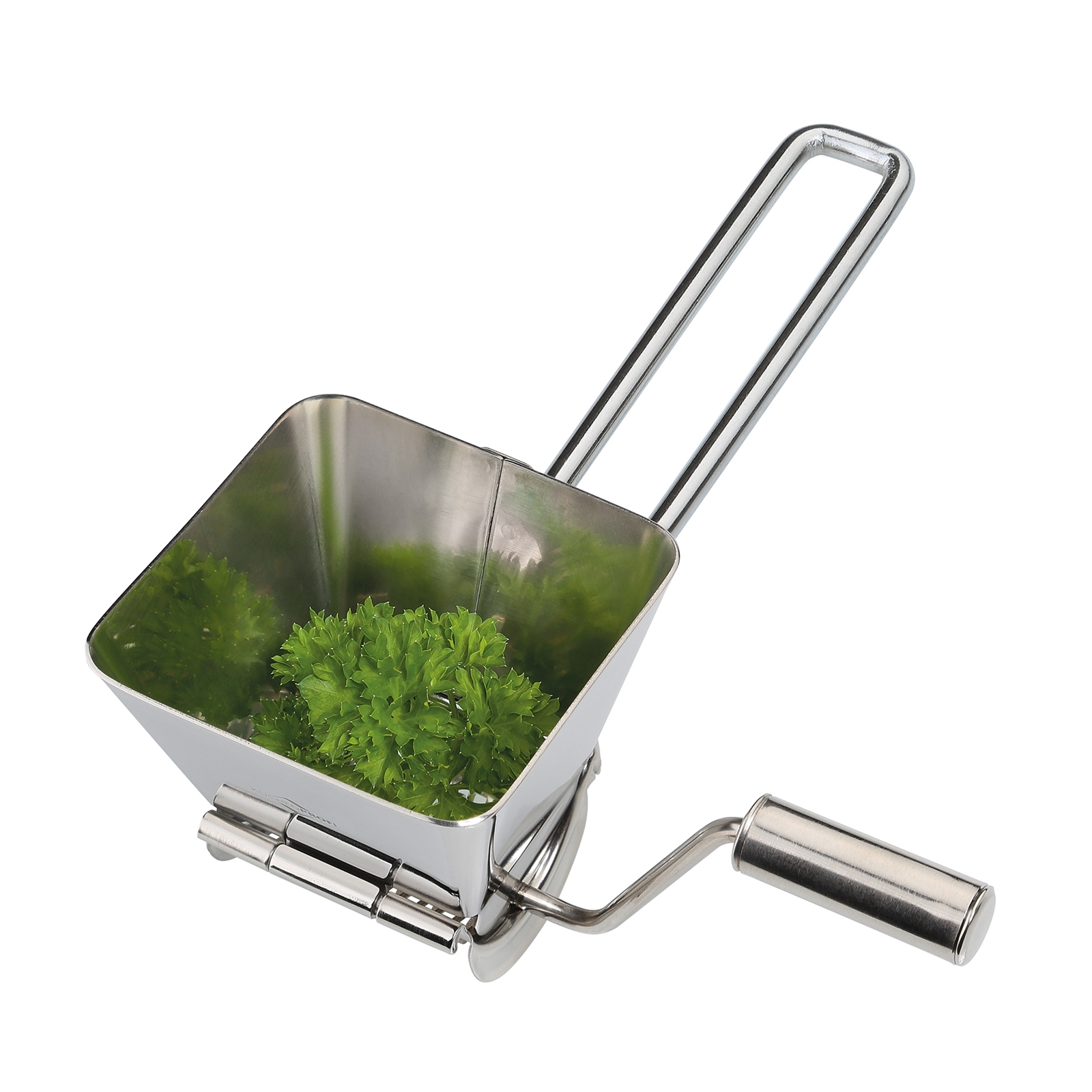 Dieser praktische Kräuterschneider zerkleinert Petersilie, Salbei, Zitronenmelisse Dill und viele andere Kräuter im Nu. Seine extra scharfen Klingen arbeiten schnell und präzise, die Kurbel lässt sich leicht drehen. Der Alltagshelfer aus rostfreiem Edelstahl ist für Rechts- und Linkshänder geeignet. Maße: L/B/H 20 x 13,5 x 7,5 cm